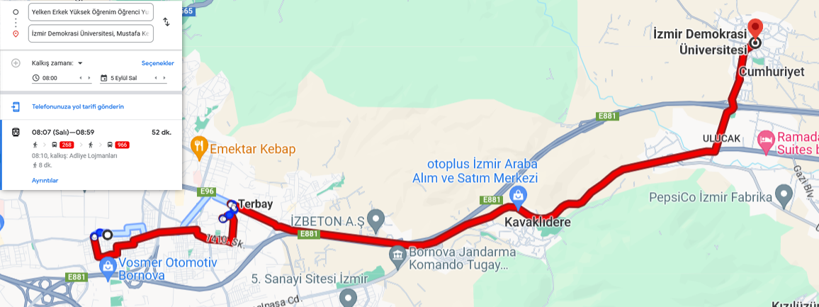 İzmir Demokrasi Üniversitesi – Hazırlık Eğitimi alacak öğrenciler, kurumumuzdan Ulucak Kampüsüne belediye otobüslerini kullanarak yaklaşık 50 dakikada ulaşabilirler.