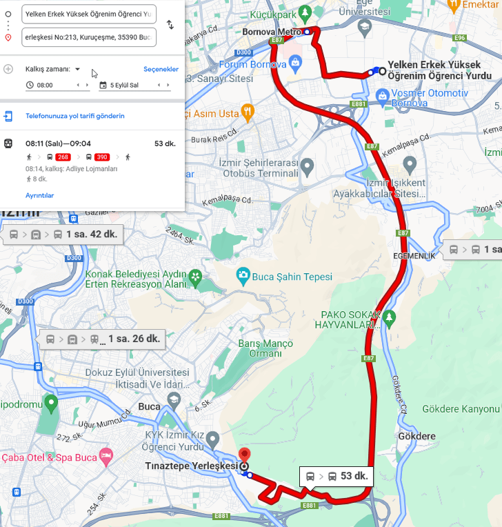 Tınaztepe yerleşkesine yaklaşık 55 dakikada ulaşabilirler.